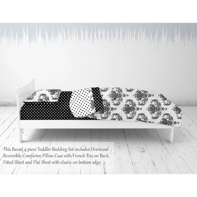 - This Bacati 4-piece Toddler Bedding Set Set Includes Reversible Oversize Comforter (42 x 55 inches), Toddler Bed Fitted Sheet(52 x 28 x 6 inches), Toddler Bed Flat Sheet(52 x 42 inches) which is fitted at the bottom to make the bed easily and Standard Pillow Case (20 x 25 inches) with french ties on the back in fun, colorful and signature prints in 100 percent cotton 200 Thread Count percale fabrics. Designed in United States by Experienced Designers. Many coordinating items available to purchase separately in this Bacati Classic Damask Black/Gray/White Bedding Collection.