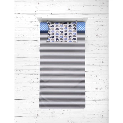 - This Bacati 4-piece Toddler Bedding Set Set Includes Reversible Oversize Comforter (42 x 55 inches), Toddler Bed Fitted Sheet(52 x 28 x 6 inches), Toddler Bed Flat Sheet(52 x 42 inches) which is fitted at the bottom to make the bed easily and Standard Pillow Case (20 x 25 inches) with french ties on the back in fun, colorful and signature prints in 100 percent cotton 200 Thread Count percale fabrics. Designed in United States by Experienced Designers. Many coordinating items available to purchase separately in this Bacati Elephants Blue Navy Gray Bedding Collection.