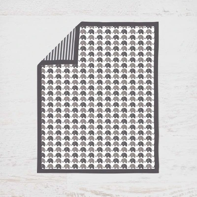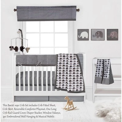 - This Bacati 10-piece Crib Set Includes Reversible Comforter/Playmat (33 x 43 inches), Crib fitted sheet (52 x 28 x 6 inches), Crib Skirt/Dust ruffle (13 inch drop) Diaper Stacker (holds more than 30 newborn diapers), Reversible Long Crib Rail Guard Cover (52 x 12 inches), Window Valance (15 h x 56 w inches with 1.75 inch Rod Pocket), 3 pc Wall Hangings Set and Musical Mobile in fun, colorful and signature prints in 100 percent cotton 200 Thread Count percale fabrics. Designed in United States by Experienced Designers. Many coordinating items available to purchase separately in this Bacati Elephants White/Gray Bedding Collection.