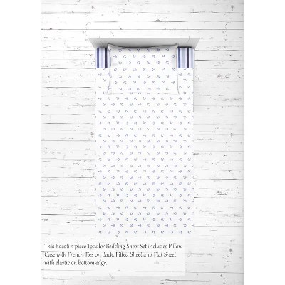 - This Bacati 3-piece Toddler Sheet Set Includes Toddler Bed Fitted Sheet (52 x 28 x 6 inches), Toddler Bed Flat Sheet(52 x 42 inches) which is fitted at the bottom to make the bed easily and Standard Pillow Case (20 x 25 inches) with rench ties on the back in fun, colorful and signature prints in 100 percent cotton 200 Thread Count percale fabrics. Designed in United States by Experienced Designers. Many coordinating items available to purchase separately in this Bacati Bedding Collection.