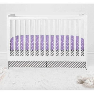 - This Bacati 10-piece Crib Set Includes Reversible Comforter/Playmat (33 x 43 inches), Crib fitted sheet (52 x 28 x 6 inches), Crib Skirt/Dust ruffle (13 inch drop) Diaper Stacker (holds more than 30 newborn diapers), Reversible Long Crib Rail Guard Cover (52 x 12 inches), Window Valance (15 h x 56 w inches with 1.75 inch Rod Pocket), 3 pc Wall Hangings Set and Musical Mobile in fun, colorful and signature prints in 100 percent cotton 200 Thread Count percale fabrics. Designed in United States by Experienced Designers. Many coordinating items available to purchase separately in this Bacati Love Aztec Gray Lilac Bedding Collection.