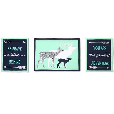 - This Bacati 10-piece Crib Set Includes Reversible Comforter/Playmat (33 x 43 inches), Two Crib fitted sheets (52 x 28 x 6 inches), Crib Skirt/Dust ruffle (13 inch drop) Diaper Stacker (holds more than 30 newborn diapers), Window Valance (15 h x 56 w inches with 1.75 inch Rod Pocket), 3 pc Wall Hangings Set and Musical Mobile in fun, colorful and signature prints in 100 percent cotton 200 Thread Count percale fabrics. Designed in United States by Experienced Designers. Many coordinating items available to purchase separately in this Bacati Noah Mint Navy Bedding Collection.