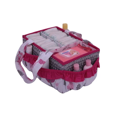 Add organization to any area of your home with the portable Nursery/Toddler Storage Caddy by Bacati. Perfect for dressers and changing stations, this lightly padded caddy has 8 outer pockets and a removable “T” separator for maximum versatility. The soft cotton percale fabric with stiffner inside keeps the shape intact, lining and handles feature a padded with polyfilled and cordinating trim. Keep diapers, wipes and other necessities tidy while traveling from room to room. Caddy also functions as an organizer for crafts, picnics, pet supplies, etc. Measures 12.5 in x 6.25 in x 8.5 in.